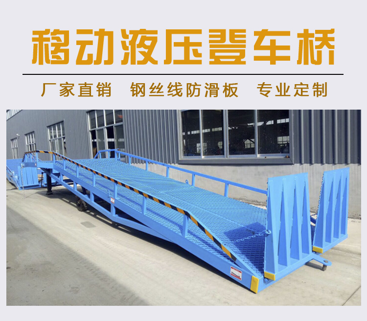 移動液壓登車橋是實(shí)現(xiàn)貨物快速裝卸的專用輔助設(shè)備,它的高度調(diào)節(jié)功能使貨車與庫房的貨臺之間架起一座橋梁,叉車等搬運(yùn)車輛通過它能直接駛?cè)胴涇噧?nèi)部進(jìn)行貨物的批量裝卸,僅需單人作業(yè),即可實(shí)現(xiàn)貨物的快速裝卸。移動液壓登車橋使企業(yè)減少大量勞力,提高工作效率,獲取更大經(jīng)濟(jì)效益。臺面均設(shè)計(jì)為網(wǎng)格狀鋼板,這種結(jié)構(gòu)能保證具有很好的強(qiáng)度,又具有防滑功能,還能方便地清掃工作臺面,使它能經(jīng)常地保持清潔、美觀。移動液壓登車橋無須外接電源,通過手搖泵做動力能輕松地在其整個(gè)調(diào)整范圍內(nèi)按50mm的倍數(shù)進(jìn)行高度的調(diào)整??梢猿浞诌m應(yīng)各種不同高度的貨車。