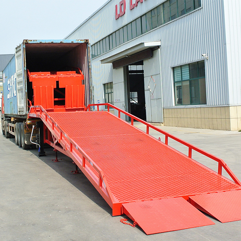 移動液壓登車橋是實現(xiàn)貨物快速裝卸的專用輔助設備,它的高度調節(jié)功能使貨車與庫房的貨臺之間架起一座橋梁,叉車等搬運車輛通過它能直接駛入貨車內(nèi)部進行貨物的批量裝卸,僅需單人作業(yè),即可實現(xiàn)貨物的快速裝卸。移動液壓登車橋使企業(yè)減少大量勞力,提高工作效率,獲取更大經(jīng)濟效益。臺面均設計為網(wǎng)格狀鋼板,這種結構能保證具有很好的強度,又具有防滑功能,還能方便地清掃工作臺面,使它能經(jīng)常地保持清潔、美觀。移動液壓登車橋無須外接電源,通過手搖泵做動力能輕松地在其整個調整范圍內(nèi)按50mm的倍數(shù)進行高度的調整,可以充分適應各種不同高度的貨車。