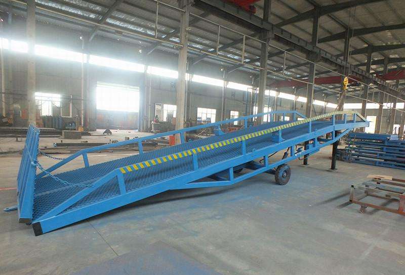 移動式液壓登車橋是實現(xiàn)貨物快速裝卸的專用輔助設備,它的高度調節(jié)功能使貨車與庫房的貨臺之間架起一座橋梁,叉車等搬運車輛通過它能直接駛入貨車內(nèi)部進行貨物的批量裝卸,僅需單人作業(yè),即可實現(xiàn)貨物的快速裝卸。移動液壓登車橋使企業(yè)減少大量勞力,提高工作效率,獲取好的經(jīng)濟效益。臺面均設計為網(wǎng)格狀鋼板,這種結構能保證具有很好的強度,又具有防滑功能,還能方便地清掃工作臺面,使它能經(jīng)常地保持清潔、美觀。移動液壓登車橋無須外接電源,通過手搖泵做動力能輕松地在其整個調整范圍內(nèi)按50mm的倍數(shù)進行高度的調整,可以充分適應各種不同高度的貨車。